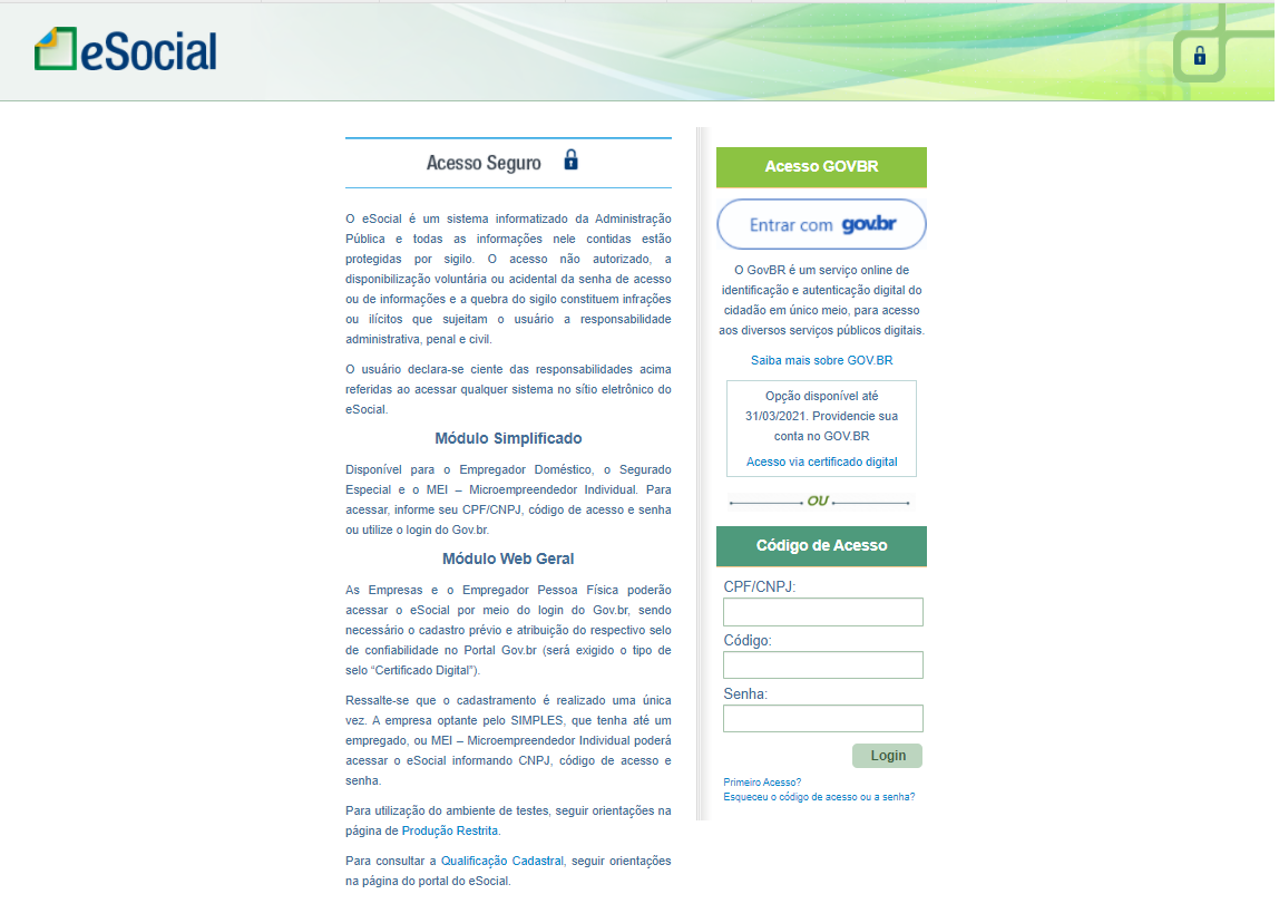 O acesso direto aos módulos web do eSocial (Doméstico, Segurado Especial, Web Geral, MEI) por certificado digital fica disponível somente até 31/03/2021.