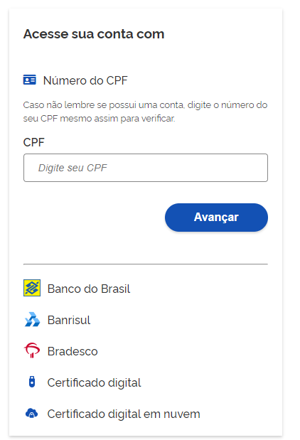 Você terá acesso a todos os serviços disponíveis para PF ou PJ caso efetue o login no Gov.br por meio do Certificado Digital ou Certificado em Nuvem e possua selo de confiabilidade do tipo Certificado Digital.